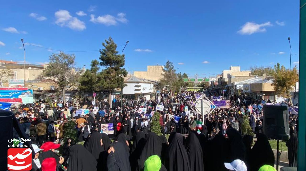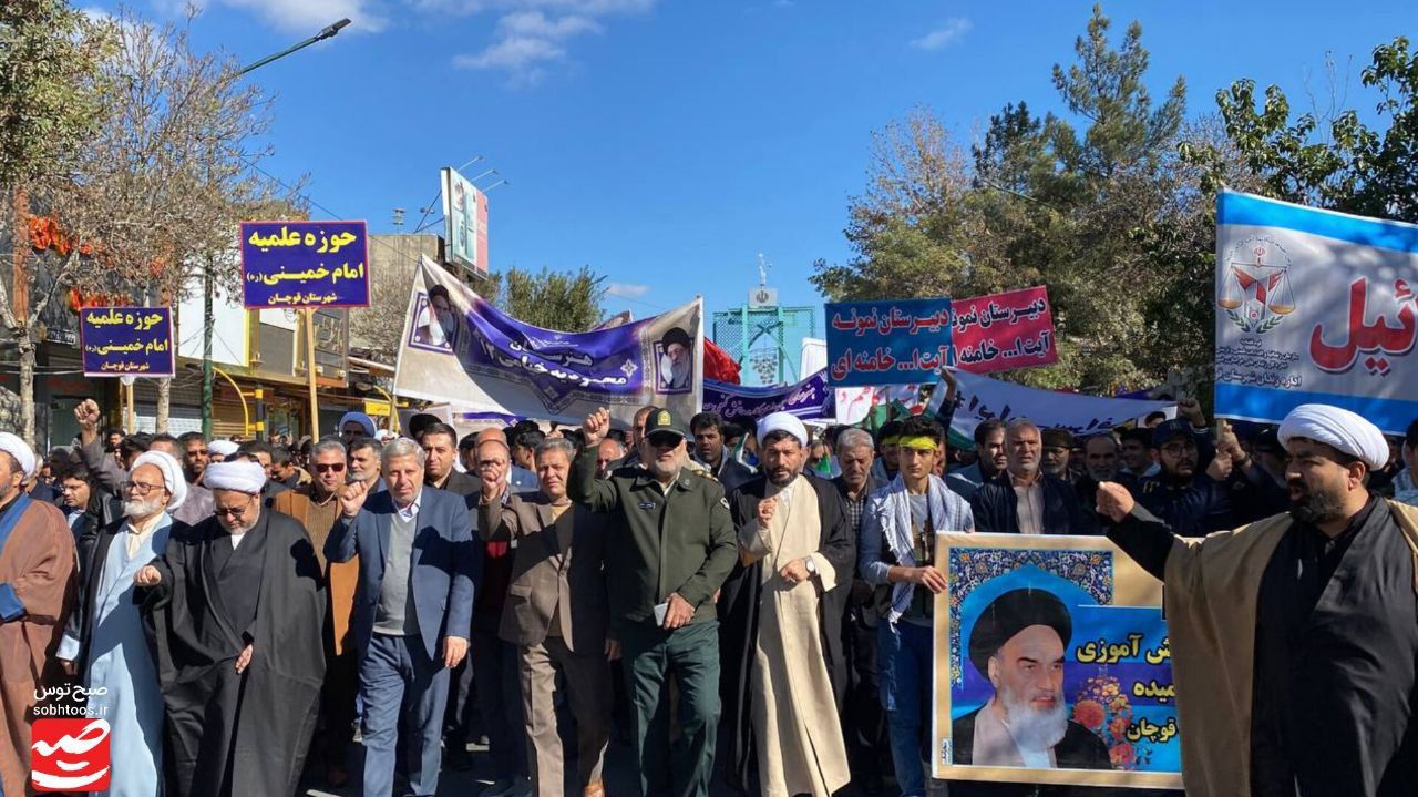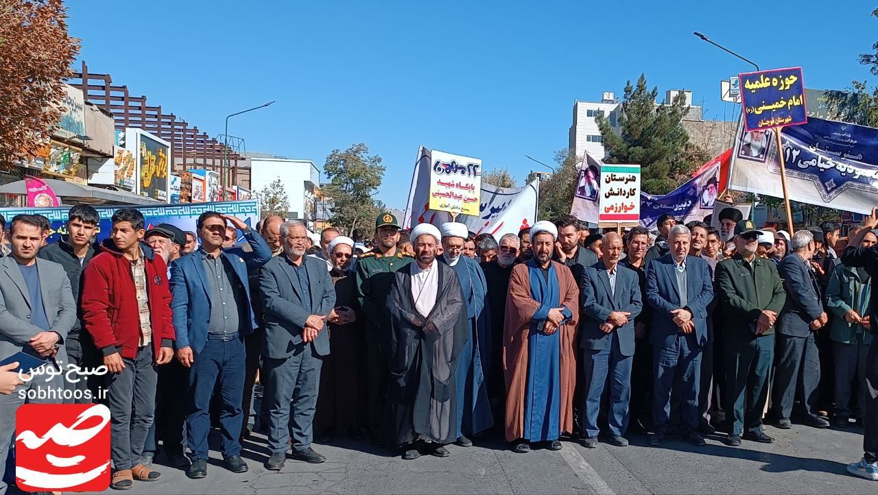 به گزارش پایگاه خبری تحلیلی «صبح توس »؛ در سالروز گرامیداشت روز ملی مبارزه با استکبار جهانی مردم مؤمن و انقلابی شهرستان قوچان همراه با دانشآموزان، فرهنگیان و اقشار مختلف، با حضوری پرشور و وحدتآفرین در راهپیمایی سراسری شرکت کردند و با در دست داشتن پرچمهای جمهوری اسلامی ایران و پلاکاردهایی با شعارهای انقلابی، بار دیگر وفاداری خود به آرمانهای امام خمینی (ره) و رهبر معظم انقلاب اسلامی را به نمایش گذاشتند.