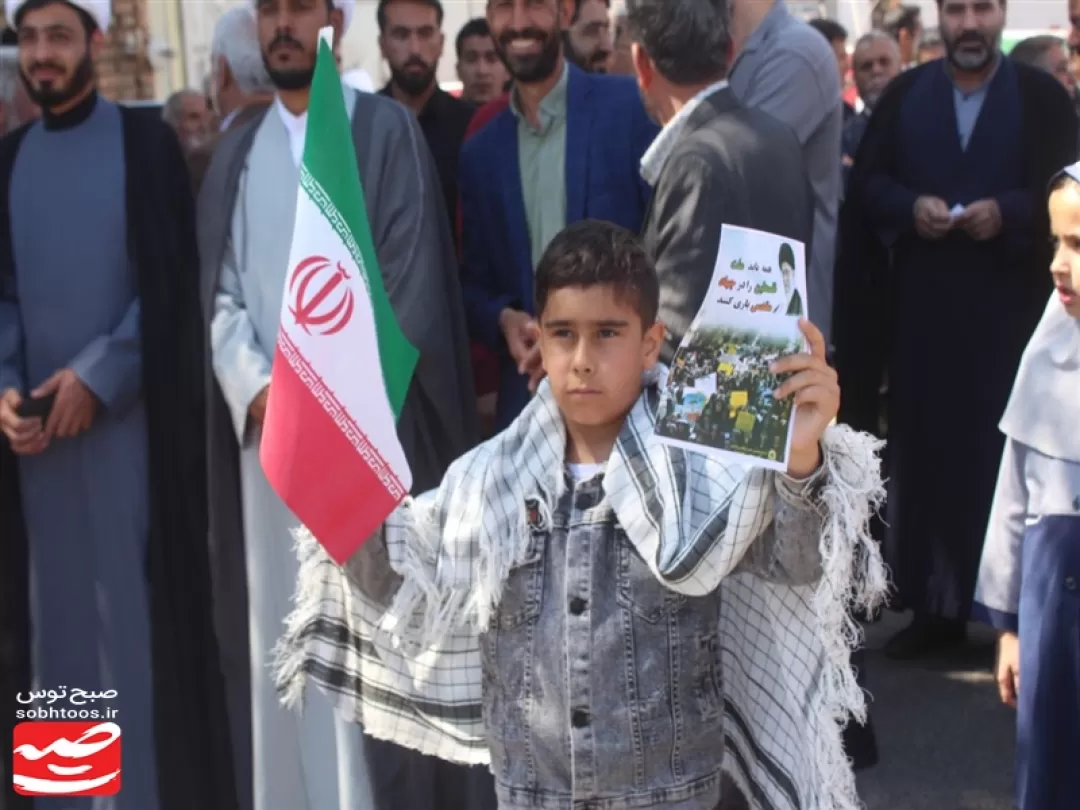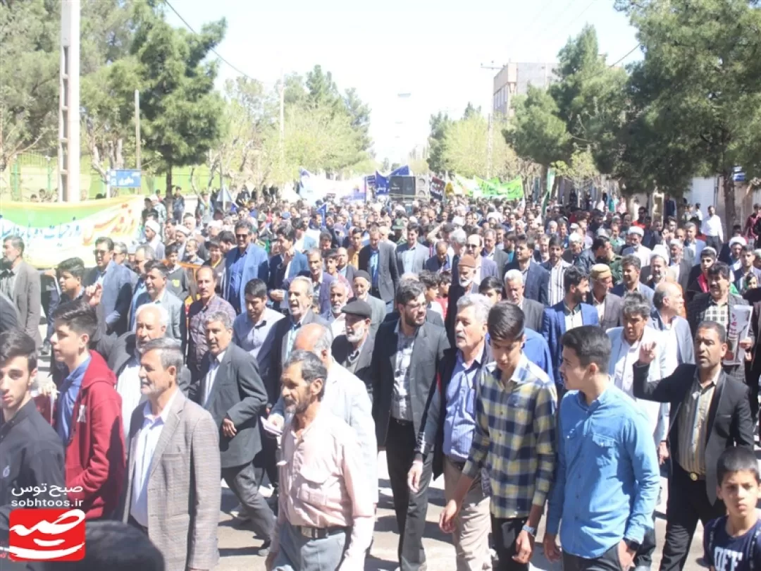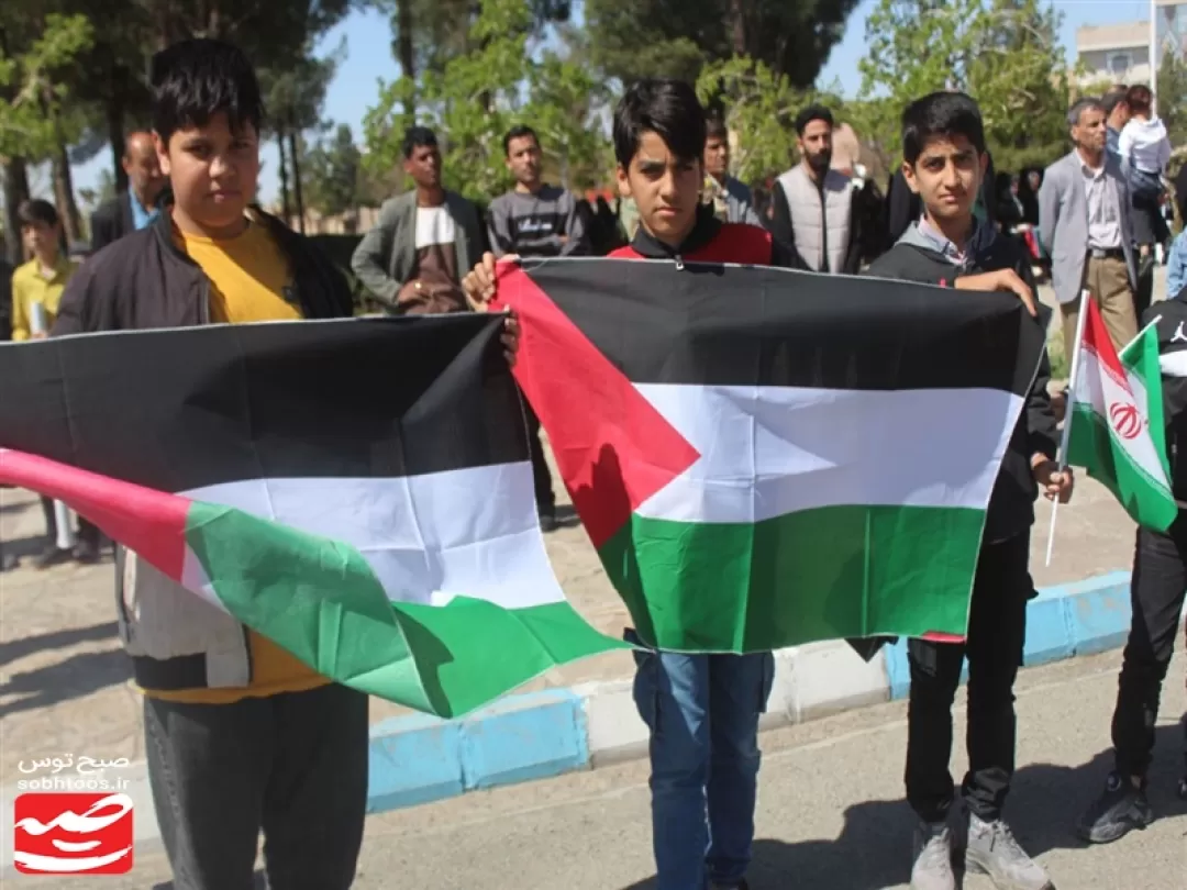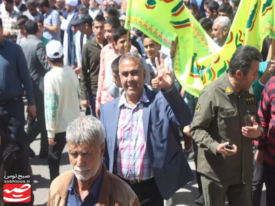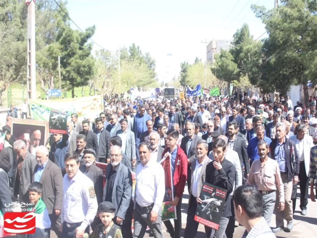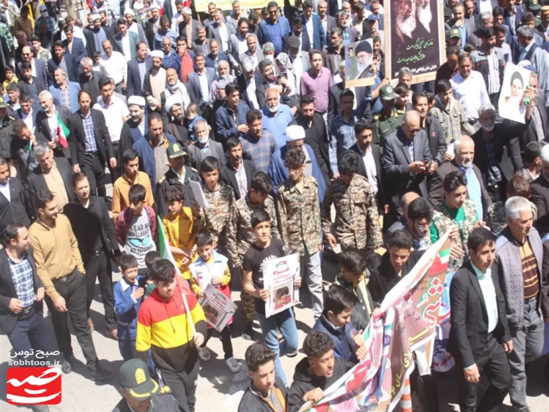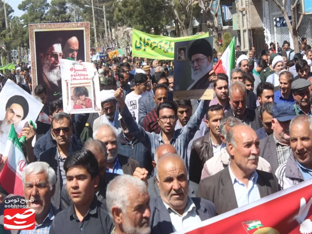 به گزارش خبرنگار پایگاه خبری تحلیلی «صبح توس»؛ مردم دیار فروغ آفتاب باری دیگر در راهپیمایی روز قدس به میدان آمدهاند تا با صدایی واحد همزمان با مسلمانان سراسر جهان جنایات رژیم جعلی اسرائیل را محکوم کنند.